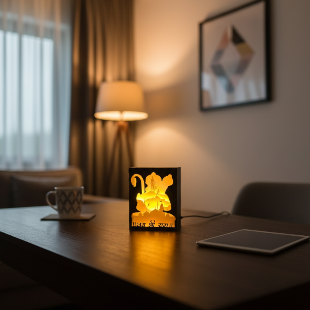 Beautifully designed with a silhouette of Lord Hanuman carrying the mountain, this lamp glows with a soft golden light, creating a peaceful and spiritual atmosphere. Perfect for your pooja room, bedroom, or living space, it also makes a meaningful gift for Diwali, Dussehra, or housewarming.